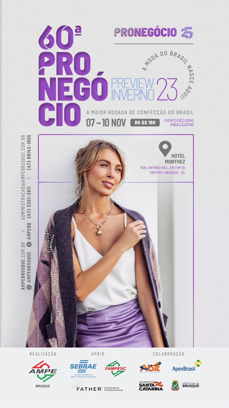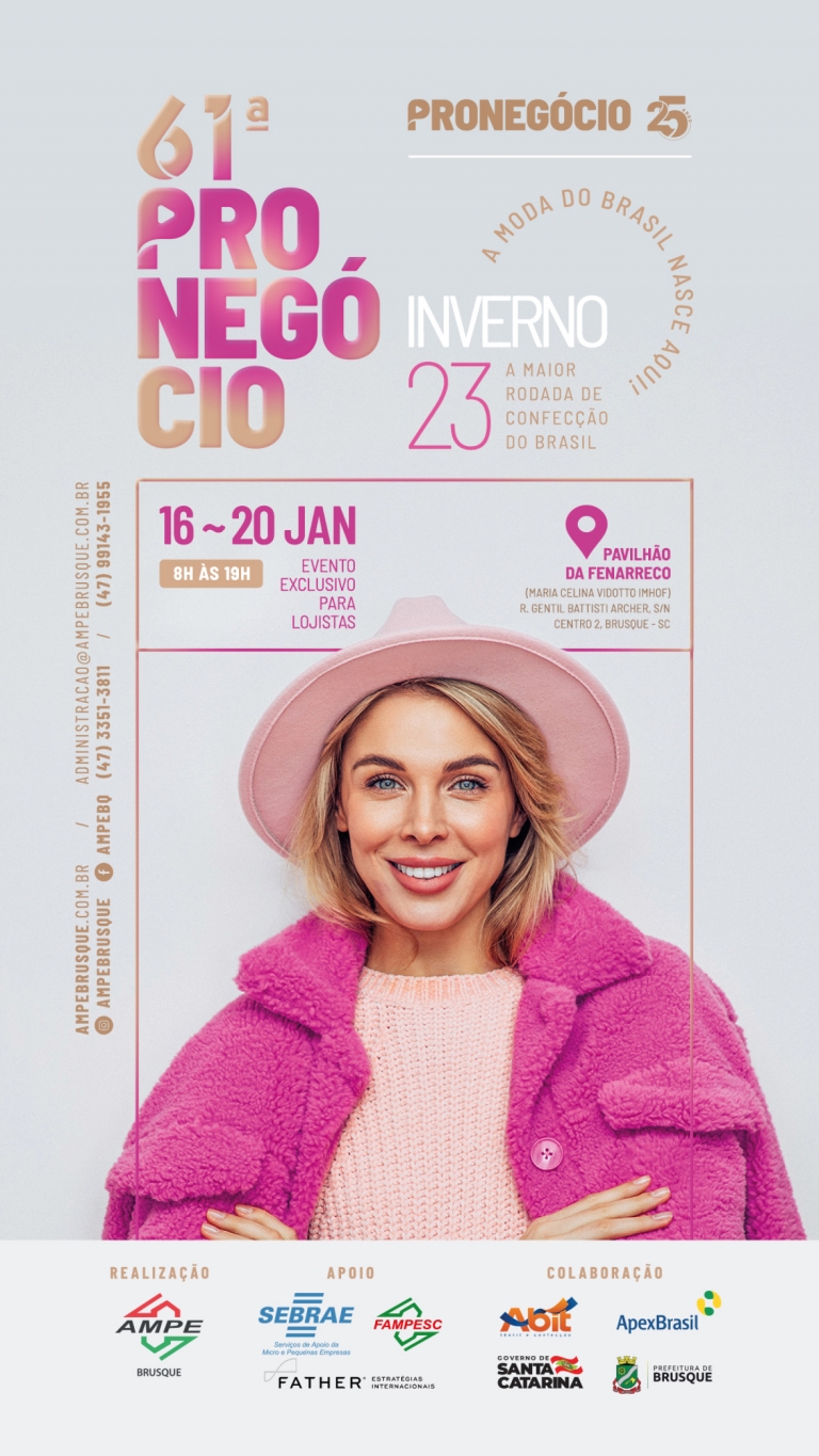Já nos dias 16 a 20 de janeiro de 2023 será realizada a 61ª Pronegócio, com a coleção Inverno 2023. O evento acontece no Pavilhão da Fenarreco, em Brusque. Mais informações: (47) 3351-3811.