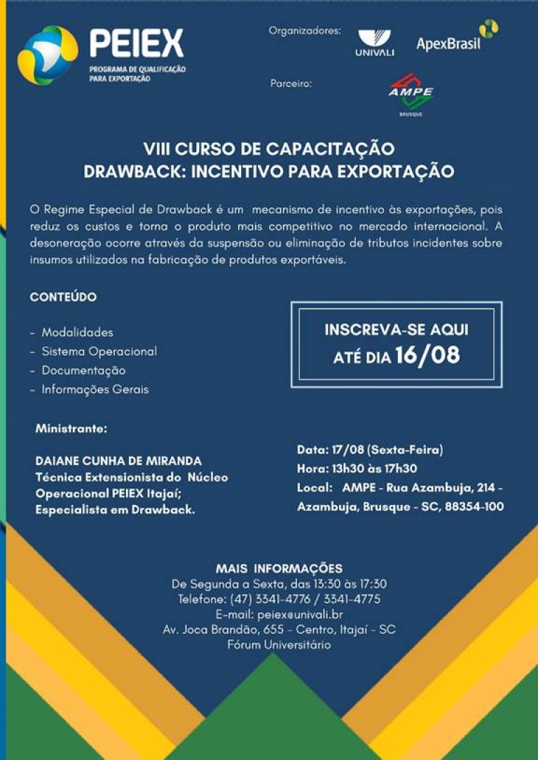 O Programa de Qualificação para Exportação (Peiex), realizado por meio da parceria entre a Universidade do Vale do Itajaí (Univali) e a Agência Brasileira da Promoção de Exportações e Investimentos (Apex-Brasil), promove nesta sexta-feira, 17 de agosto, o workshop ”Drawback: incentivo para exportação”. A capacitação ocorrerá na sede Associação de Micro e Pequenas Empresas de Brusque e Região (AmpeBr), das 13h30 às 17h30.