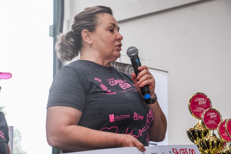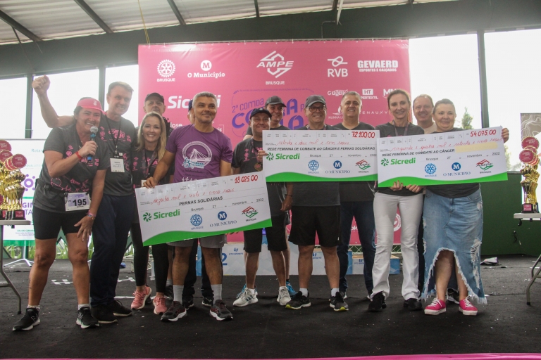 A presidente da Rede Feminina de Combate ao Câncer de Brusque, Miriam Ribeiro, comemorou o cheque recebido, no valor de R$ 54.075,00. “Em nome da nossa entidade, estou feliz e realizada ao ver tantos atletas que, mesmo com chuva, fizeram questão de estar aqui e contribuir. Muitos se inscreveram porque acreditam no projeto e se alegram pela possibilidade de ajudar”, destacou. Para ela, o valor doado chega em um bom momento e será útil nas despesas da instituição, como o pagamento dos colaboradores, com o 13º salário e férias, além de despesas no atendimento gratuito oferecido à comunidade. “Por isso, só posso agradecer aos organizadores do evento, especialmente à AmpeBr e aos demais parceiros. Estar aqui também é uma forma de levar a informação sobre a importância da prevenção do câncer de mama”, ressaltou.