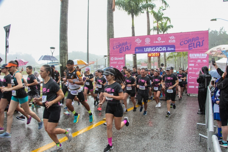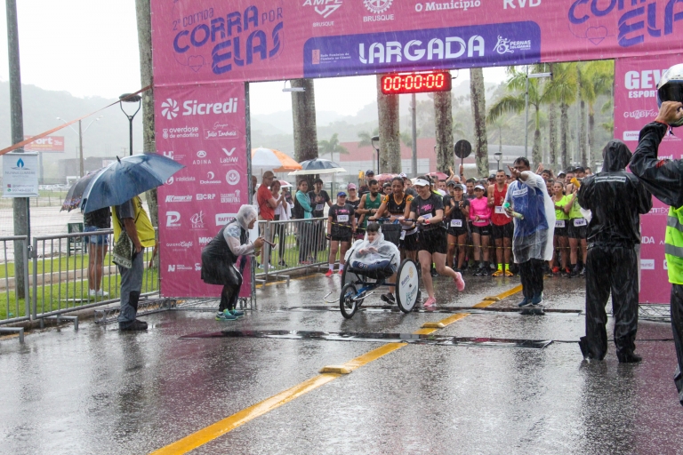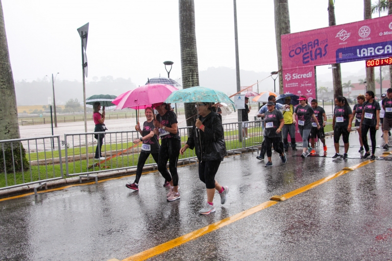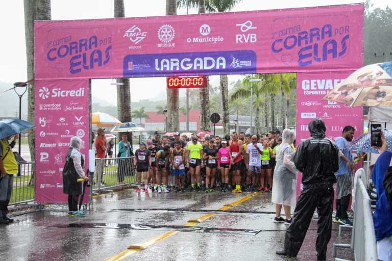 A chuva intensa que caiu na manhã de domingo, 27 de novembro, em Brusque, não desanimou os mais de 1.200 inscritos na 2ª edição da Corra Por Elas. Mesmo embaixo de chuva, corredores e corredoras, profissionais ou amadores, de diversas idades, não deixaram de completar o percurso de cinco ou dez quilômetros, ou de participar da caminhada. O evento, realizado pela Associação das Micro e Pequenas Empresas de Brusque e Região (AmpeBr), em parceria com o Rotary Club de Brusque e o jornal O Município, teve largada em frente ao Pavilhão da Fenarreco, e contou com todo o valor arrecadado das inscrições, no valor de R$ 72.100,00, em prol de duas instituições da cidade: a Rede Feminina de Combate ao Câncer, contemplada com R$ 54.075,00 (75% do valor) e o projeto Pernas Solidárias, que recebeu o total de R$ 18.025,00 (25%).