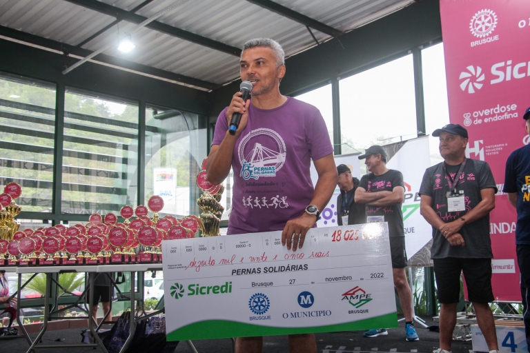 Da mesma forma, o coordenador e presidente do Pernas Solidárias Brusque, Theodoro Pereira falou sobre a satisfação e a emoção de ser contemplado com a doação e principalmente em ver tantos participantes engajados no evento. “As pessoas entenderam o objetivo da corrida, chamaram amigos, familiares, colegas de trabalho, e a chuva foi apenas um detalhe, acredito que até ajudou a refrescar a prova. Agradecemos demais a todos os que participaram desse projeto de solidariedade que contribuiu muito para o nosso projeto”, pontuou.
