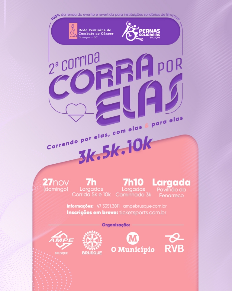 Neste domingo, 27 de novembro, a Associação das Micro e Pequenas Empresas de Brusque e Região (AmpeBr), em parceria com o Rotary Club de Brusque e o jornal O Município, promovem a “2ª Corra Por Elas". O evento, que terá a saída do Pavilhão Fenarreco, em Brusque, terá largadas às 7h, para a corrida de 5km e 10km individual, masculino e feminino. Já às 7h10 acontece a largada da caminhada, de 3km. Também haverá a corrida kids, que terá percurso definido conforme as idades das crianças participantes.