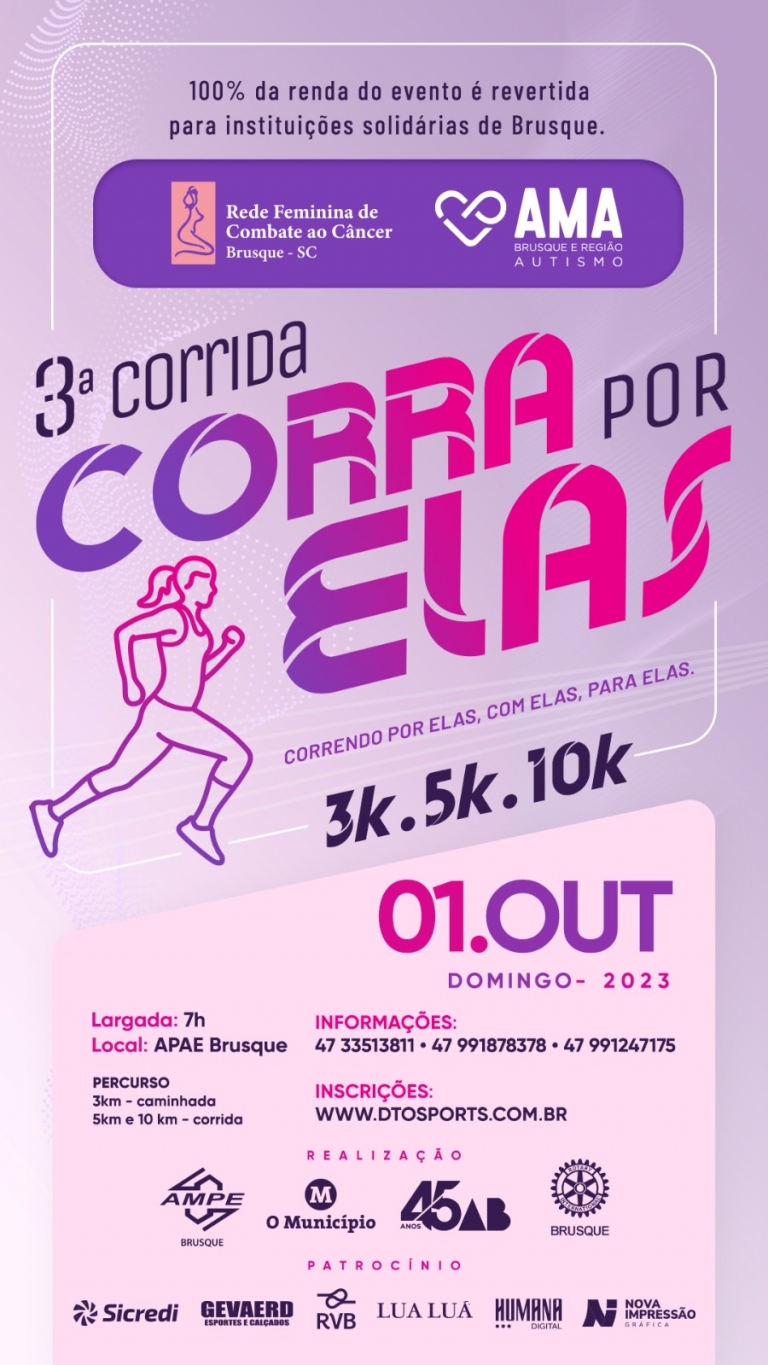 A corrida acontece no dia 1º de outubro, domingo, e nesta edição terá do valor arrecadado voltado para a Rede Feminina de Combate ao Câncer de Brusque (RFCC) e para a Associação de Pais, Profissionais e Amigos dos Autistas de Brusque e Região (AMA Brusque).