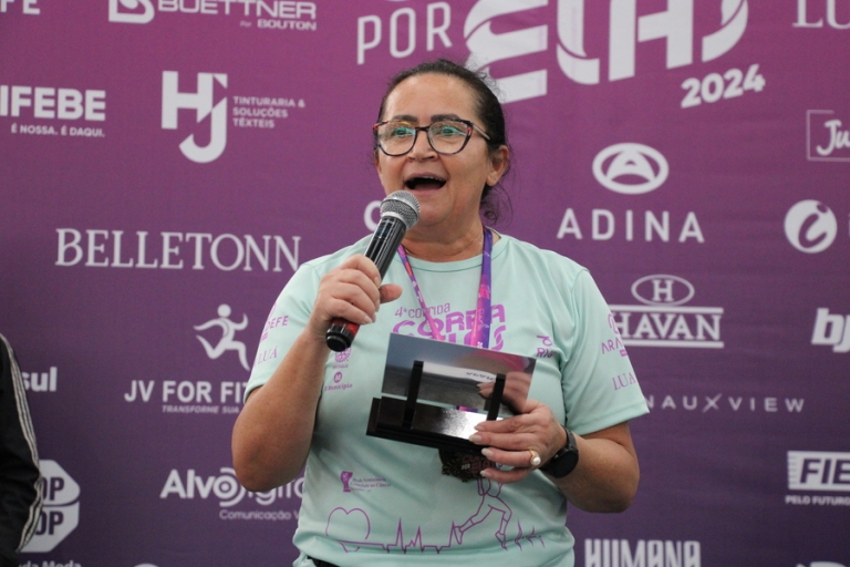 A moradora de Brusque, Regina Padoani, 55 anos, foi uma das atletas inscritas para a 4ª Corra por Elas. Ela corre há alguns anos e, desta vez, a corrida teve um significado especial, já que ela está retornando para o esporte após alguns meses parada em decorrência do tratamento contra o câncer de mama. "Descobri o câncer em fevereiro. Estou em tratamento, fazendo quimioterapia e depois será a cirurgia. Agora estou voltando aos poucos a correr, mas não desisto jamais. Fé na frente toda a vida", declarou.