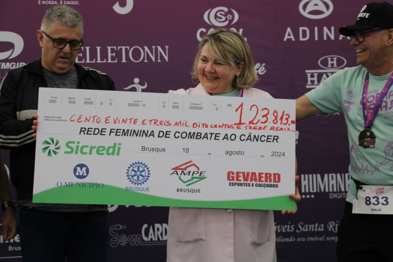 A presidente da Rede Feminina de Combate ao Câncer de Brusque, Miriam Evangelista Ribeiro, enaltece a solidariedade da população de Brusque e região, que não mede esforços para contribuir com a instituição. "É uma emoção receber esse dinheiro, ver todo esse povo aqui e saber que as pessoas querem ajudar. Graças a Deus, com isso, conseguimos atender cada vez mais mulheres. Agradeço a AmpeBr, aos atletas, aos empresários e toda a nossa população, pois Brusque é uma cidade solidária", pontuou.