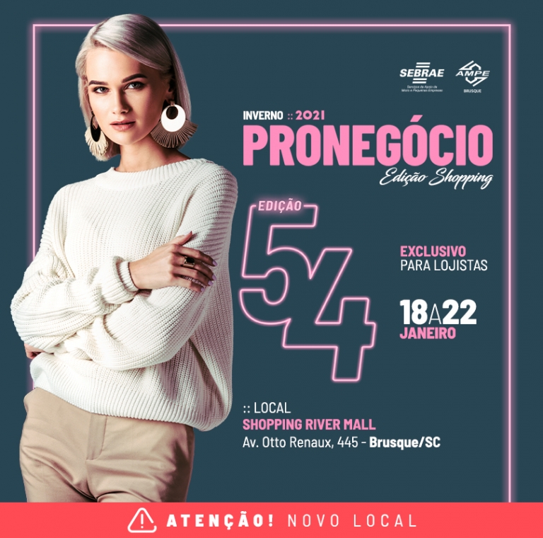 A Associação das Micro e Pequenas Empresas de Brusque e Região (AmpeBr), em parceria com o Sebrae/SC, realiza a partir da próxima segunda-feira, 18 de janeiro, até sexta-feira, 22, a 54ª Pronegócio. O evento desta vez será realizado de forma presencial, no Shopping River Mall, no bairro São Luiz, em Brusque, já que esta edição precisou ser adaptada para seguir as medidas preventivas da Covid-19.
