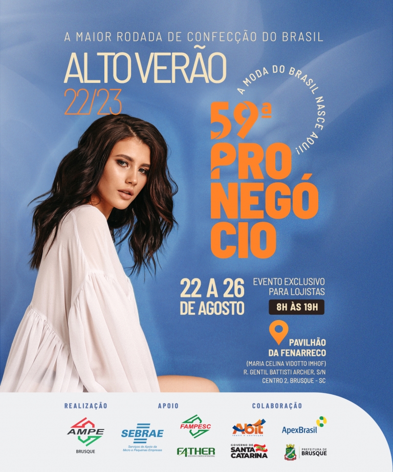 Entre os dias 22 a 26 de agosto, a Associação das Micro e Pequenas Empresas de Brusque e Região (AmpeBr) promove mais uma edição da maior rodada de confecção do Brasil: a 59ª Pronegócio. Na oportunidade, lojistas de todo o país poderão negociar diretamente com dezenas de fabricantes de Santa Catarina produtos da coleção Alto Verão 2022-2023. O evento acontece no Pavilhão da Fenarreco, e é exclusivo para lojistas e para confeccionistas de Santa Catarina.