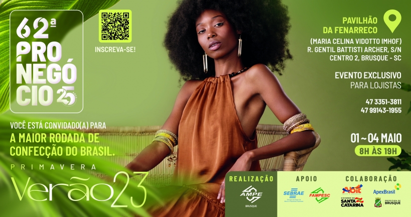 Ter acesso aos principais produtos de confecção de mais de 150 fabricantes de Santa Catarina, poder negociar diretamente com os fornecedores e garantir as principais tendências da coleção Primavera Verão 2023: tudo em um só local, de forma ágil e objetiva. Assim será a 62ª Pronegócio, a maior rodada de confecção do Brasil, que tem mais uma edição neste mês de maio de 2023. O evento, exclusivo para lojistas, acontece no Pavilhão da Fenarreco, em Brusque (SC) e será, mais uma vez, realizado pela Associação das Micro e Pequenas Empresas de Brusque e Região (AmpeBr), em parceria com o Sebrae/SC.
