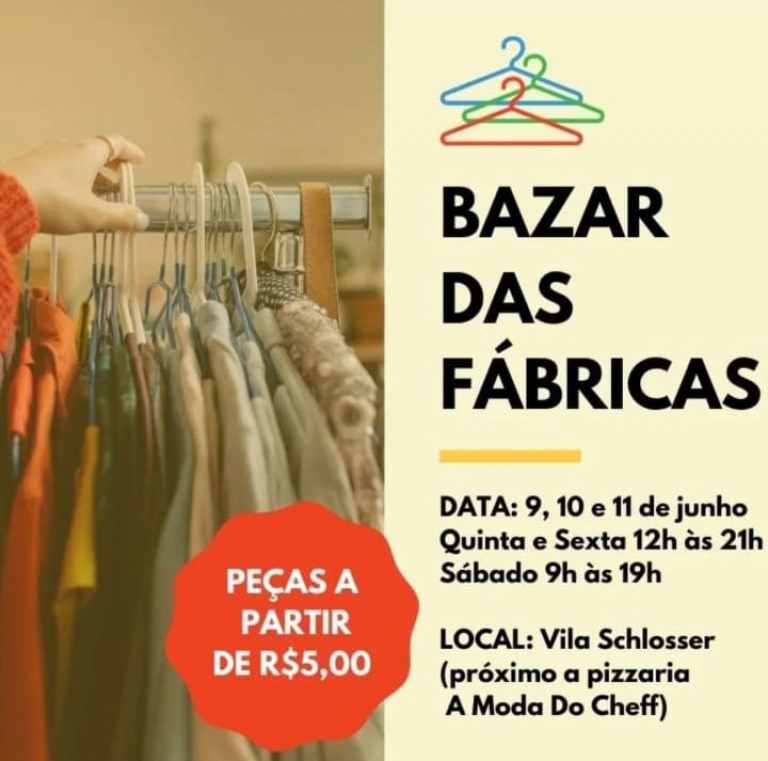 Entre os dias 9, 10 e 11 de junho, será realizado na Villa Schlosser, mais uma edição do Bazar das Fábricas. O evento é organizado por algumas empresas que integram a Associação das Micro e Pequenas Empresas de Brusque e Região (AmpeBr). Na oportunidade serão comercializados peças masculinas, femininas, infantil, moda fitness, plus size, entre outras, de 13 empresas/marcas, a partir do valor de R$ 5.