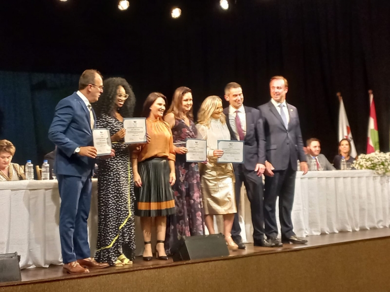 A presidente da Associação das Micro e Pequenas Empresas de Brusque e Região (AmpeBr), Sandra Werner, acompanhada dos diretores Mauro Schoening e Carlos Alberto Velloso, estiveram na noite de quarta-feira, 23 de março, na solenidade de posse da nova diretoria da Ordem dos Advogados do Brasil (OAB) Subseção de Brusque, para o triênio 2022/2024. Realizado no teatro do Centro Empresarial, Social e Cultural de Brusque (CESCB), o evento reuniu representantes de diversas entidades locais, além de advogados da esfera regional, estadual e nacional.