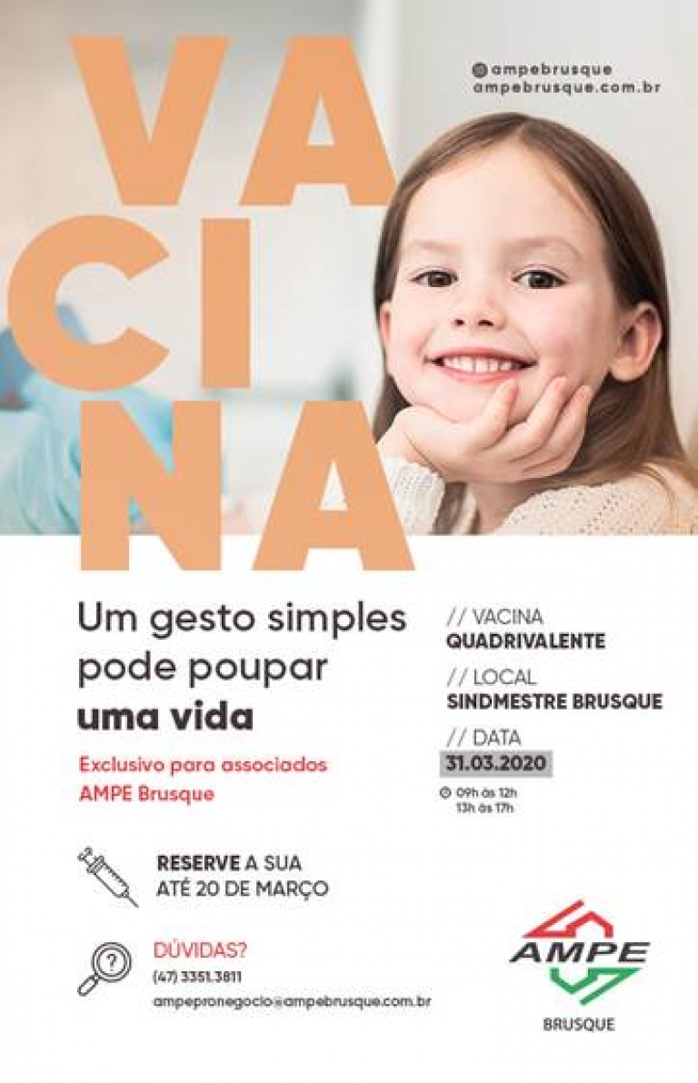 A Associação das Micro e Pequenas Empresas de Brusque e Região (AmpeBr) realiza, por mais um ano consecutivo, a tradicional Campanha de Vacinação contra a Gripe. Este ano a campanha acontece no dia 31 de março, terça-feira, das 9h às 12h e das 13h às 17h, na sede do Sindmestre – Sindicato dos Mestres e Contramestres de Brusque (rua Arthur Kistenmacher, nº 96 – Azambuja). Na oportunidade serão feitas as aplicações das doses, novamente em parceria com o SESI.