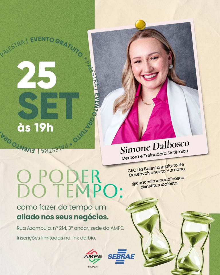 A Associação das Micro e Pequenas Empresas de Brusque (AmpeBr) promove, no dia 25 de setembro, a palestra “O poder do tempo: Como fazer do tempo um aliado nos seus negócios”. O evento acontece às 19 horas, na sede da entidade e será ministrado pela mentora e treinadora sistêmica, Simone Dalbosco.