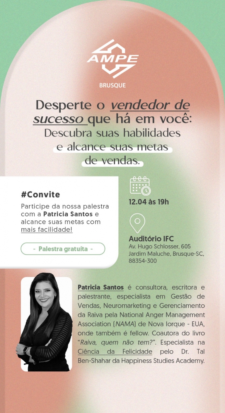 A Associação das Micro e Pequenas Empresas de Brusque e Região (AmpeBr), em parceria com o Sebrae/SC, promove nesta quarta-feira, 12 de abril, a palestra "Desperte o vendedor de sucesso que há em você: descubra suas habilidades e alcance suas metas de vendas".