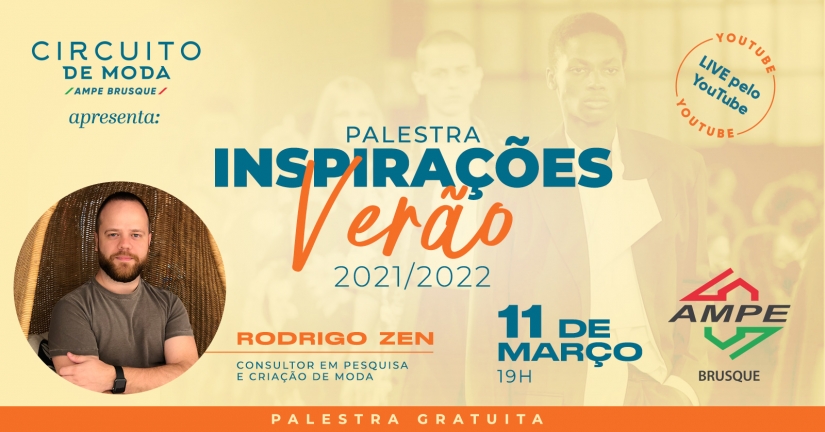 A Associação das Micro e Pequenas Empresas de Brusque e Região (AmpeBr) realiza na quinta-feira, 11 de março, a primeira edição de 2021 do ‘Circuito de Moda Ampe Brusque’, que apresenta a palestra ‘Inspirações Verão 2021/2022’, com Rodrigo Zen, coordenador do LAB Moda da AmpeBr e consultor criativo do THOMZEN Bureau Créative.