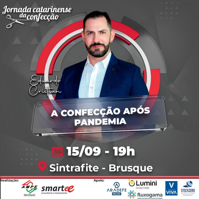 A Associação das Micro e Pequenas Empresas de Brusque e Região (AmpeBr) promove no dia 15 de setembro, quarta-feira, a palestra "A confecção após a pandemia", com Eduardo Cristian.