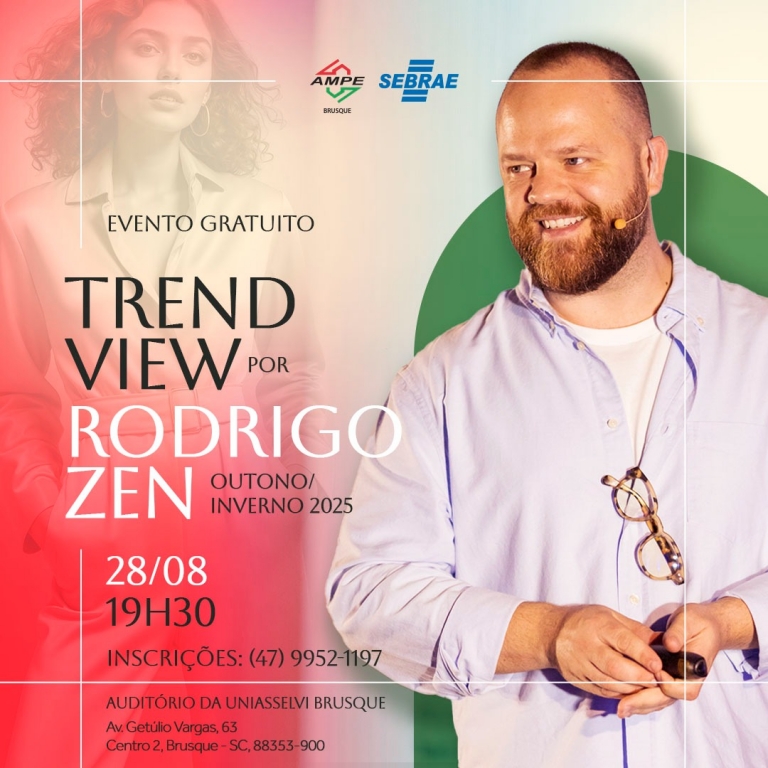 A Associação das Micro e Pequenas Empresas de Brusque e Região (AmpeBr), em parceria com o Sebrae, promove, no dia 28 de agosto, a palestra Trend View Outono/Inverno 2025, com Rodrigo Zen. O evento será realizado no Auditório da Uniasselvi Brusque e inicia às 19h30. Na oportunidade, o especialista abordará as principais tendências para a estação.