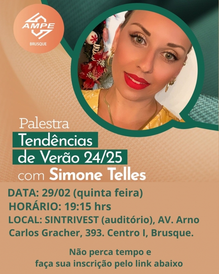 O Núcleo Têxtil da Associação das Micro e Pequenas Empresas de Brusque e Região (AmpeBr), em parceria com o Sebrae/SC, promove no dia 29 de fevereiro a palestra Tendências Verão 2024/25. Ministrada pela especialista Simone Telles, a capacitação será no auditório do Sintrivest, às 19h15.