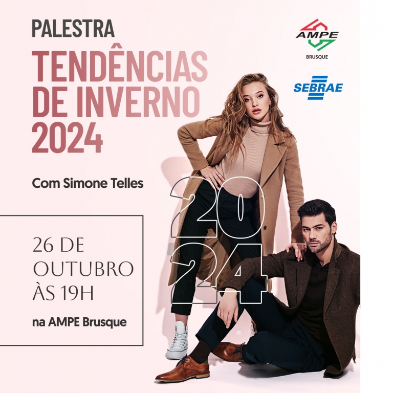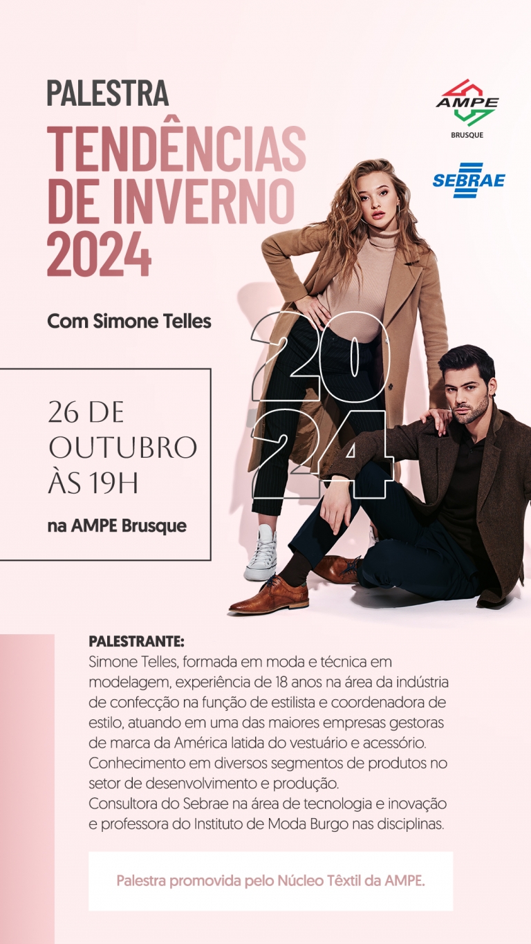 No dia 26 de outubro, o Núcleo Têxtil da Associação das Micro e Pequenas Empresas de Brusque e Região (AmpeBr), em parceria com o Sebrae/SC, promove a palestra "Tendências de Inverno 2024", com a especialista, Simone Mendes. A palestra será na sede do Instituto Federal Catarinense (IFC), a partir das 19h. As inscrições podem ser feitas pelo link:https://bit.ly/3LYNQW6