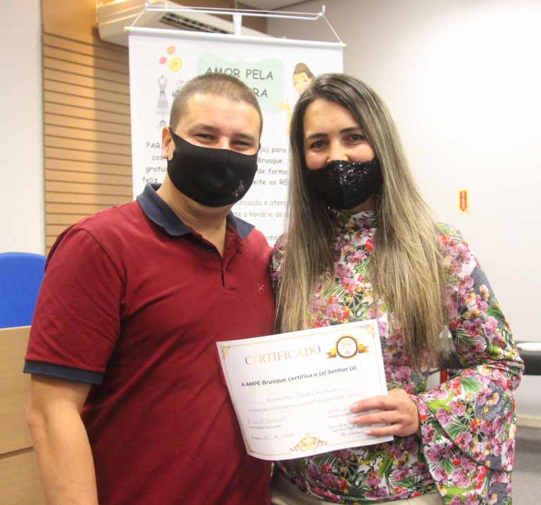 O sonho da motorista de Uber é semelhante ao de Rute Rodrigues Barbosa Correa, de 44 anos, que há 13 mora em Brusque. Ela trabalhava no ramo da limpeza e um dia, ficou atenta ao que a rádio anunciava: era o curso da AmpeBr. “Eu sempre quis aprender a costurar, mas como geralmente eram cursos pagos, não conseguia fazer. Quando soube desse curso, consegui me inscrever. Comprei uma máquina e já estou trabalhando na área. Para mim hoje é um dia feliz e só tenho a agradecer à AmpeBr por dar essa oportunidade a todas nós”, conta ela, que foi à formatura acompanhada do marido Valdecir.