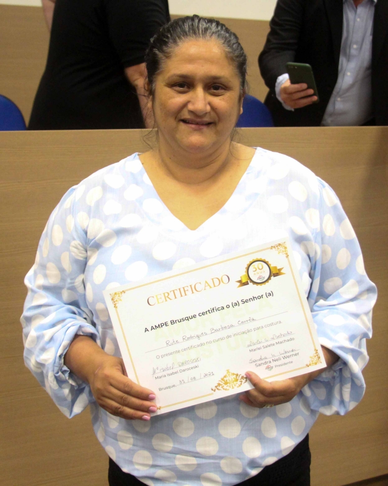 Uma corrida de Uber garantiu à motorista do aplicativo, Vanderlea Mendes da Silva, de 44 anos, uma nova profissão: a de costureira. Natural do Rio de Janeiro, ela conta que desde que passou a morar em Brusque, há cinco anos, percebeu o quão forte é o setor de confecção e começou a nutrir a vontade de atuar na área. Há alguns meses ficou sabendo do curso profissionalizante ‘Amor pela Costura’, realizado pela Associação das Micro e Pequenas Empresas de Brusque e Região (AmpeBr), quando fez uma corrida para uma passageira até a entidade. Vanderlea não perdeu tempo, no mesmo dia fez sua inscrição e pouco tempo depois iniciou as aulas. Na noite de terça-feira, 31 de agosto, ela estava entre as 65 mulheres que se formaram no curso, em solenidade realizada no auditório do Sindicato dos Trabalhadores nas Indústrias de Fiação e Tecelagem de Brusque (Sintrafite). “Fiz o curso, gostei muito e pretendo agora adquirir mais experiência para empreender nessa área”, revela. A veia empreendedora é incentivada pelo marido, Rafael Viviani, que tem familiares que já empreenderam no setor, no interior do Rio de Janeiro e acompanhou com orgulho a formatura da esposa. Agora, Vanderlea segue com o foco de aprender ainda mais.