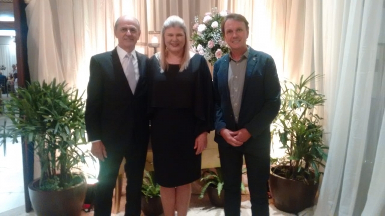 O vice-presidente da Associação das Micro e Pequenas Empresas de Brusque e Região (AmpeBr), Mauro Schoening, acompanhado do diretor Aderbal Montibeller, estiveram na noite do dia 9 de abril na sessão solene de posse da nova reitoria do Centro Universitário de Brusque (Unifebe).