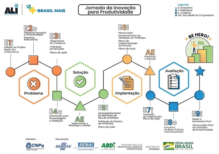 • A empresa será acompanhada por um período de 4 meses, por um Agente Local de Inovação (ALI), durante 6 encontros individuais, mais 3 encontros coletivos, que fará um sprint de inovação com mapeamento do problema e implantação de solução para aumento de faturamento ou redução de custo. Vide jornada da inovação