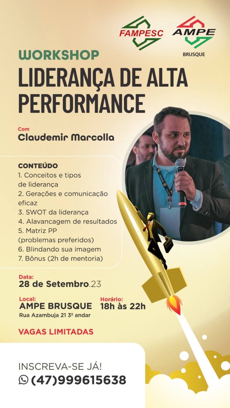 A Associação das Micro e Pequenas Empresas de Brusque (AmpeBr), em parceria com o Sebrae/SC, promove o Workshop “Liderança de Alta Performance”, no dia 28 de setembro. O evento ocorre na sede da entidade, às 18 horas, com carga horária de 4h, e será ministrado pelo especialista Claudemir Marcolla.