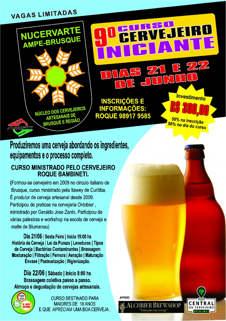 Nos dias 21 e 22 de junho o Núcleo dos Cervejeiros Artesanais da Associação das Micro e Pequenas Empresas de Brusque e Região (AmpeBr) realiza mais uma edição do Curso de Cervejeiro Iniciante, na sede da entidade.