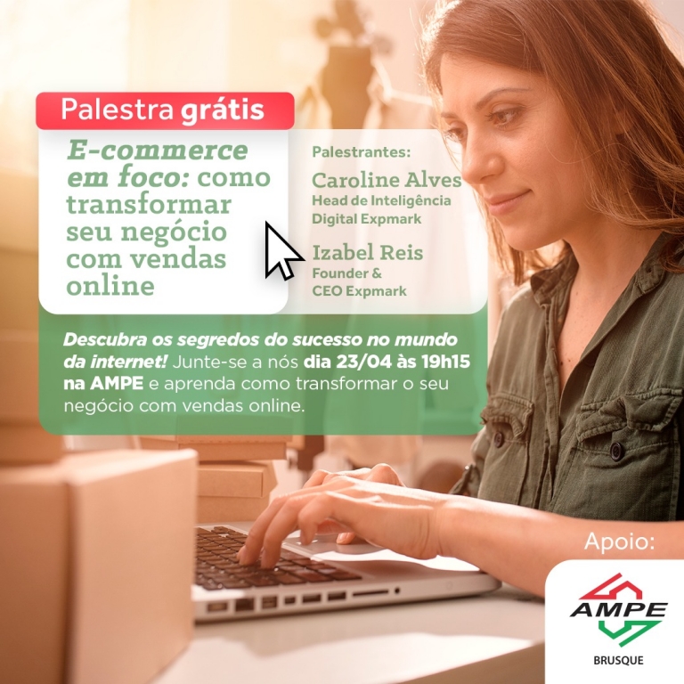 O Núcleo Têxtil da Associação das Micro e Pequenas Empresas de Brusque e Região (AmpeBr), promove a palestra “E-commerce em foco: Como transformar seu negócio com vendas on-line”, na terça-feira, 23 de abril. Ministrada pela ceo da Expmark, Izabel Reis, e pela head de Inteligência Digital da Expmark, Caroline Alves, a capacitação será realizada na sede da entidade, às 19h15.
