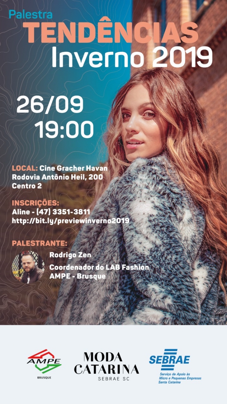 Na próxima quarta-feira, 26 de agosto, a Associação das Micro e Pequenas Empresas de Brusque e Região (AmpeBr), em parceria com o Sebrae/SC e o projeto Moda Catarina, realiza a palestra 'Tendências Inverno 2019'. O evento acontece às 19h, no Cine Gracher Havan e será ministrado pelo coordenador do LAB Fashion da AmpeBr, Rodrigo Zen.