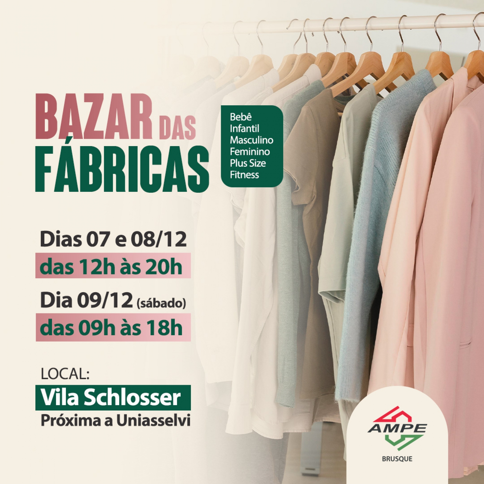 29/11/2023 AmpeBr realiza Bazar das Fábricas em dezembro Serão comercializadas peças masculinas, femininas, infantil, moda fitness e plus size